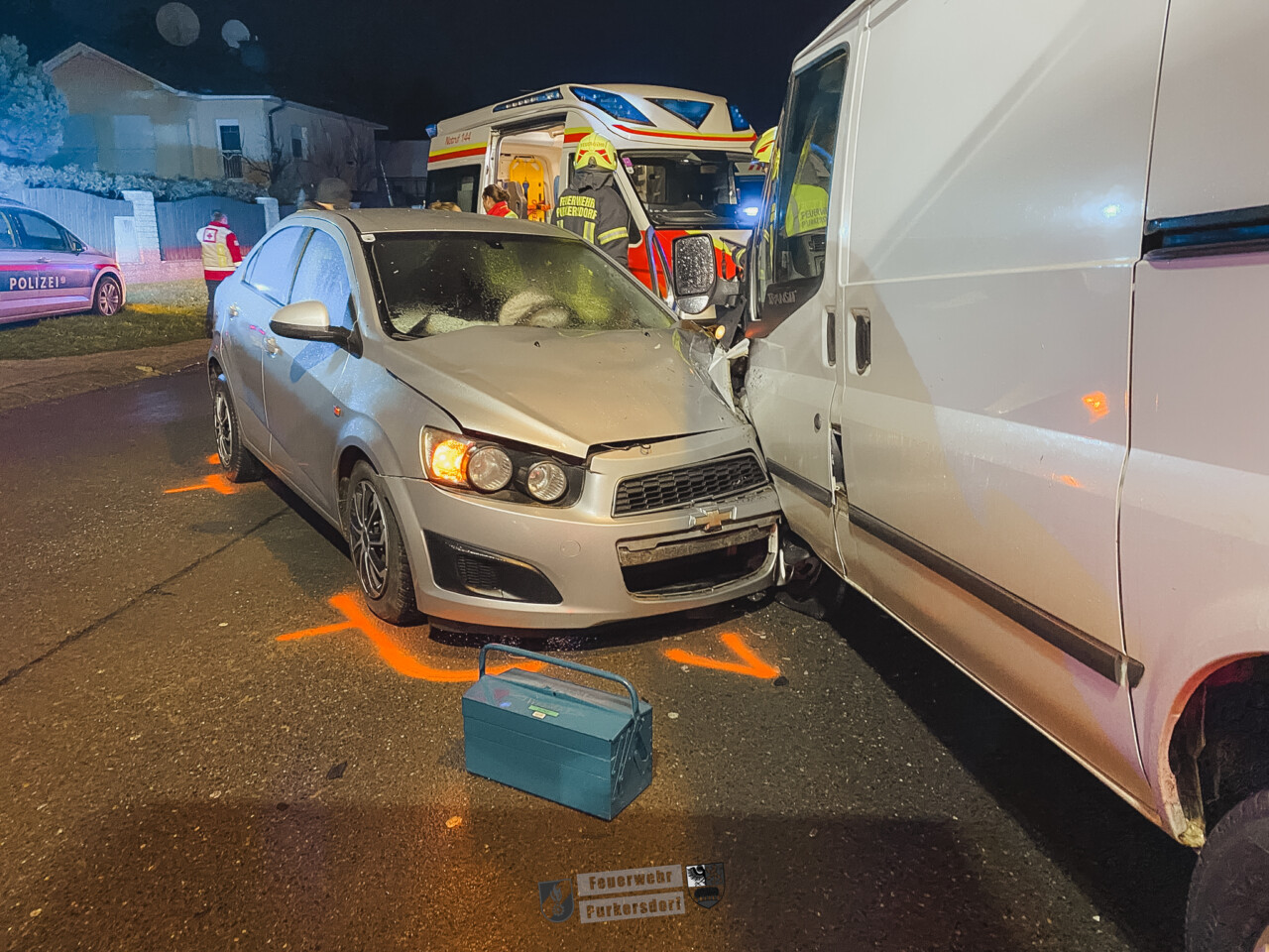 Beim Eintreffen der Einsatzkräfte stellte sich heraus, dass die beiden Fahrzeuge stark ineinander verkeilt waren. Für die Bergung war daher der Einsatz von technischem Gerät erforderlich. Mithilfe der Seilwinde des Wechselladefahrzeugs konnten die Fahrzeuge voneinander getrennt und geborgen werden. Eines der KFZ wurde anschließend mit Rangierrollern verschoben und gesichert abgestellt, während der weiße Kleinbus mittels Seilwinde geborgen wurde.