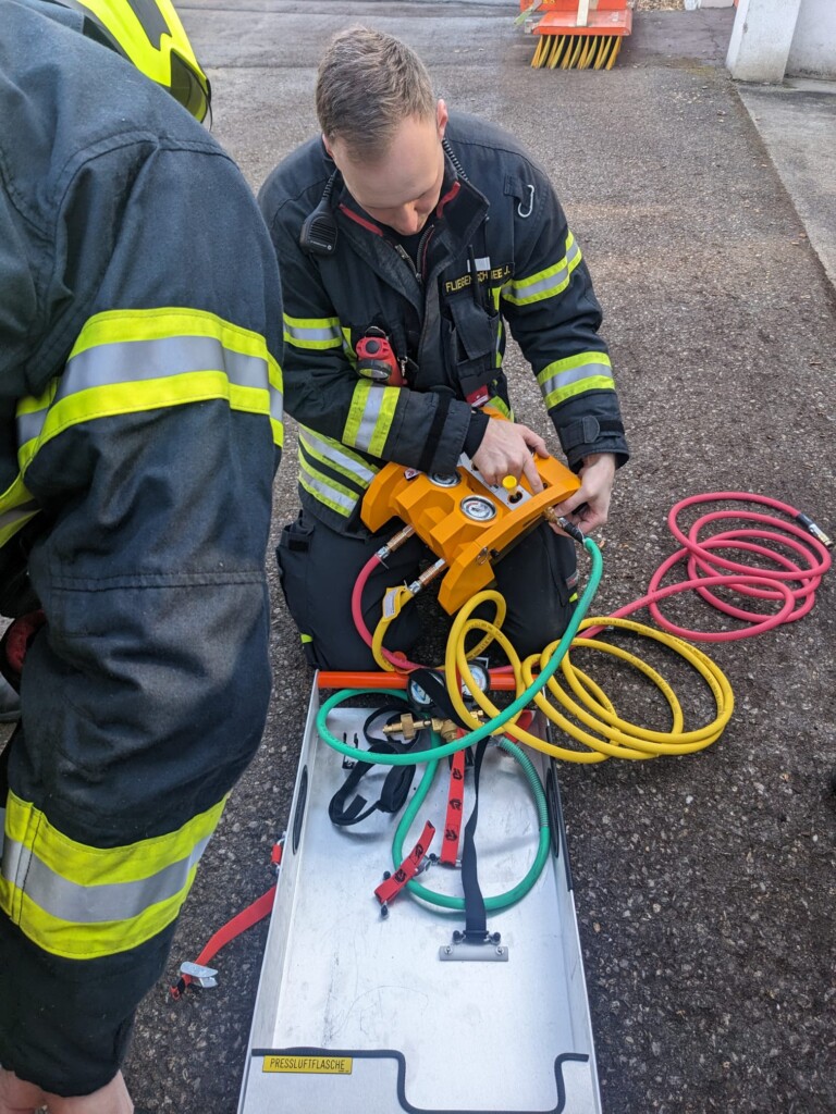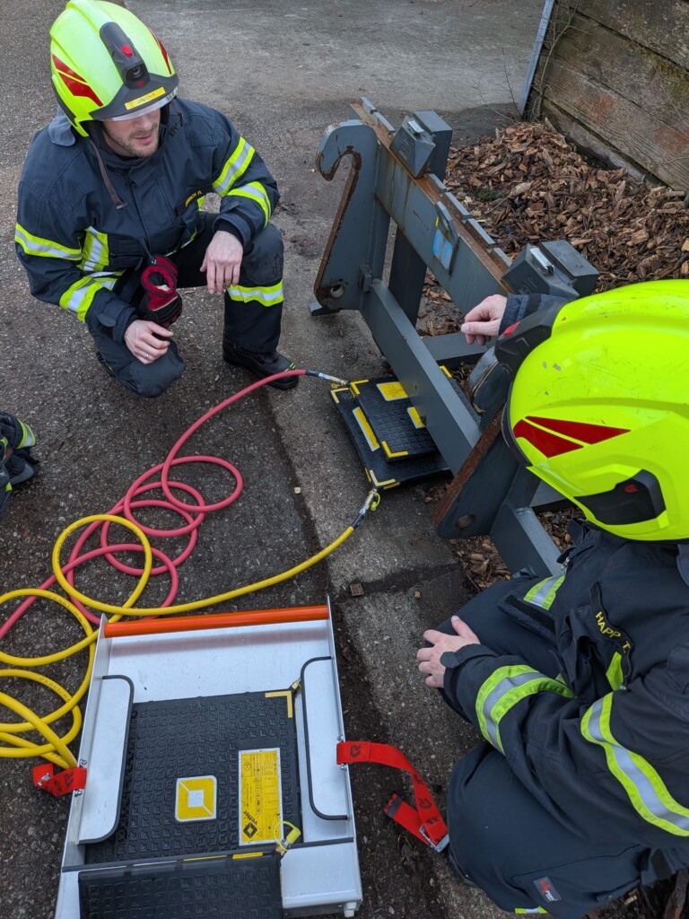 Abschließend wurde eine eingeklemmte Person unter der Gabel eines Gabelstaplers angenommen. Mittels Schnellangriffseinrichtung und Hebekissen wurde die Last angehoben und die Person befreit. Zusätzlich wurde die alternative Druckversorgung über Haspel und Fahrzeug beübt.