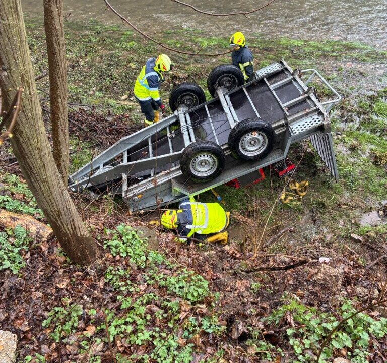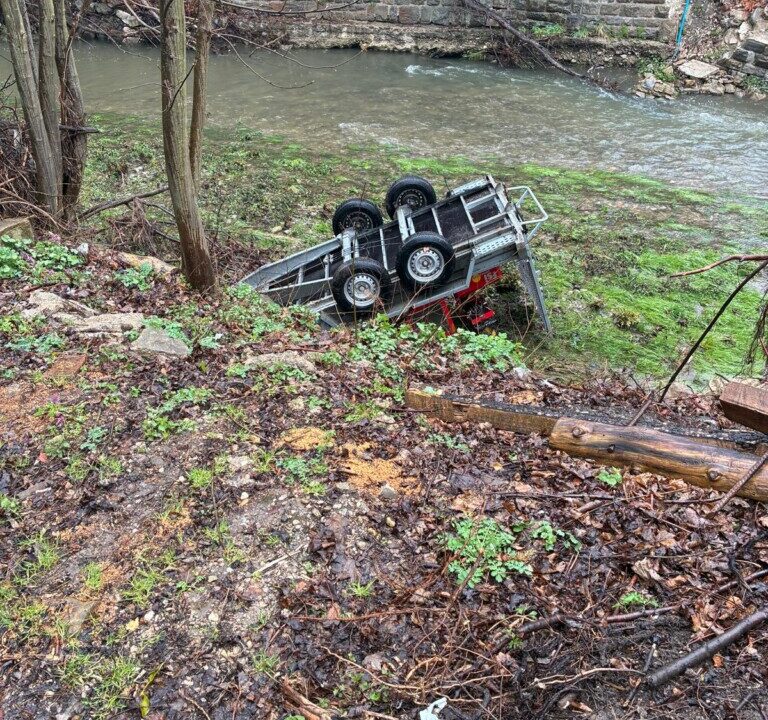 Ein Anhänger, beladen mit einer kleinen Forstmaschine, ist nach dem Abhängen vom Zugfahrzeug ins Rollen geraten.